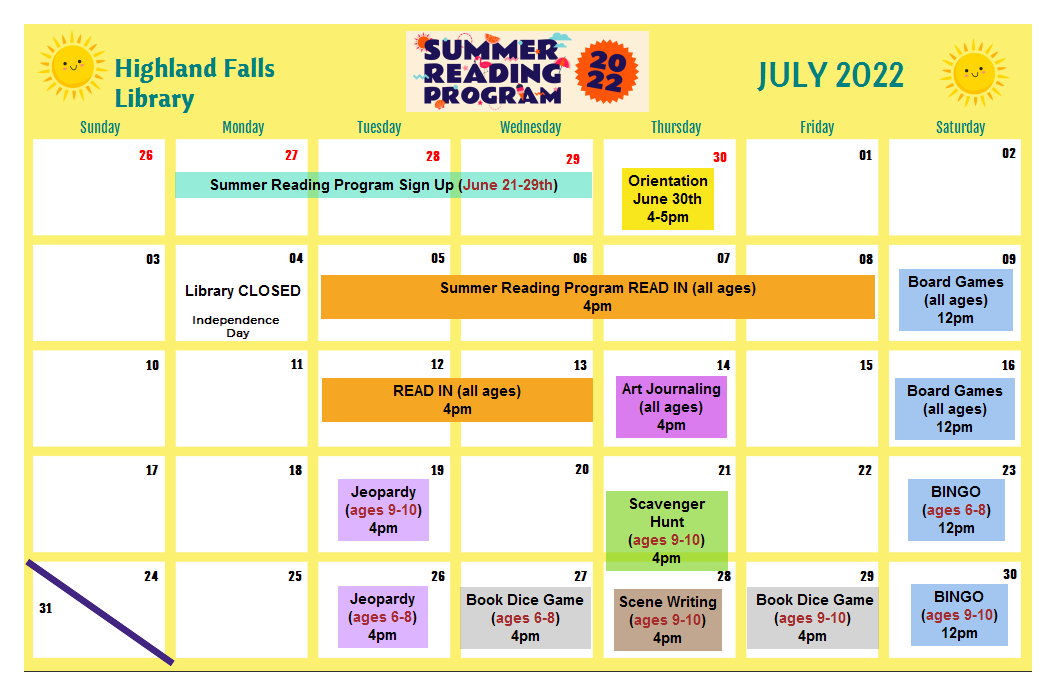 The Summer Reading Program schedule for July is out. You can view it anytime by going to the Calendar of Events page.