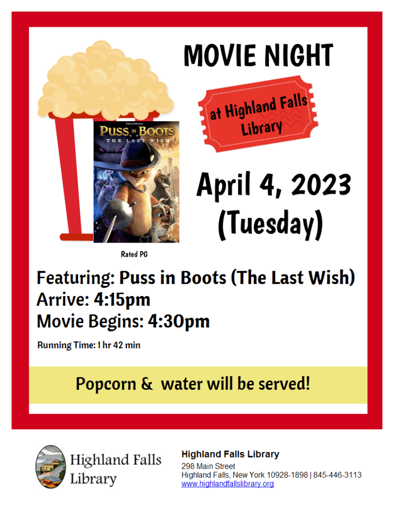 Join us for MOVIE NIGHT at Highland Falls Library April 4th