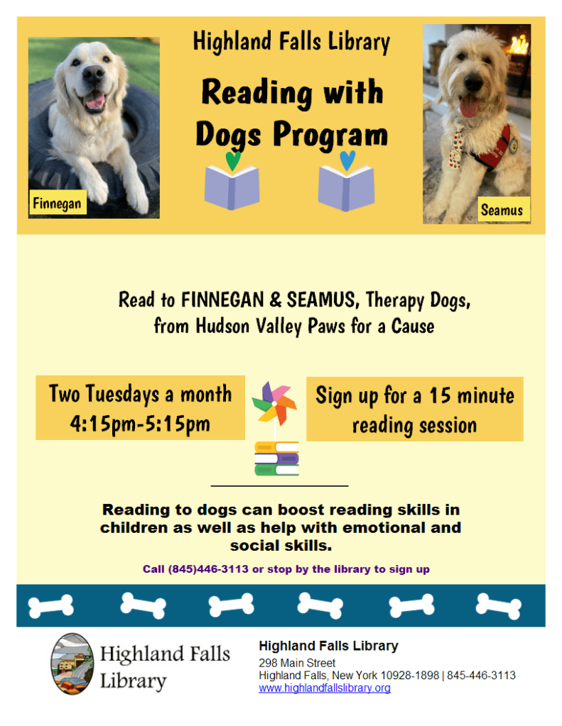 There are a few openings left to read to Seamus, our Therapy Dog, in the Reading with Dogs Program tomorrow, Tuesday, June 6th from 4:15pm-5:15pm.