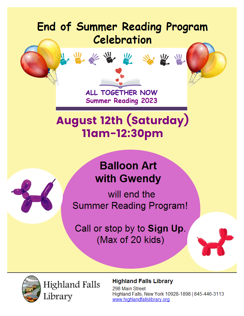 Participants of the Summer Reading Program who have earned stars on our Summer Reading chart are invited to Balloon Art with Gwendy on August 12th. Note: There are only 20 spots available so sign up as soon as possible.