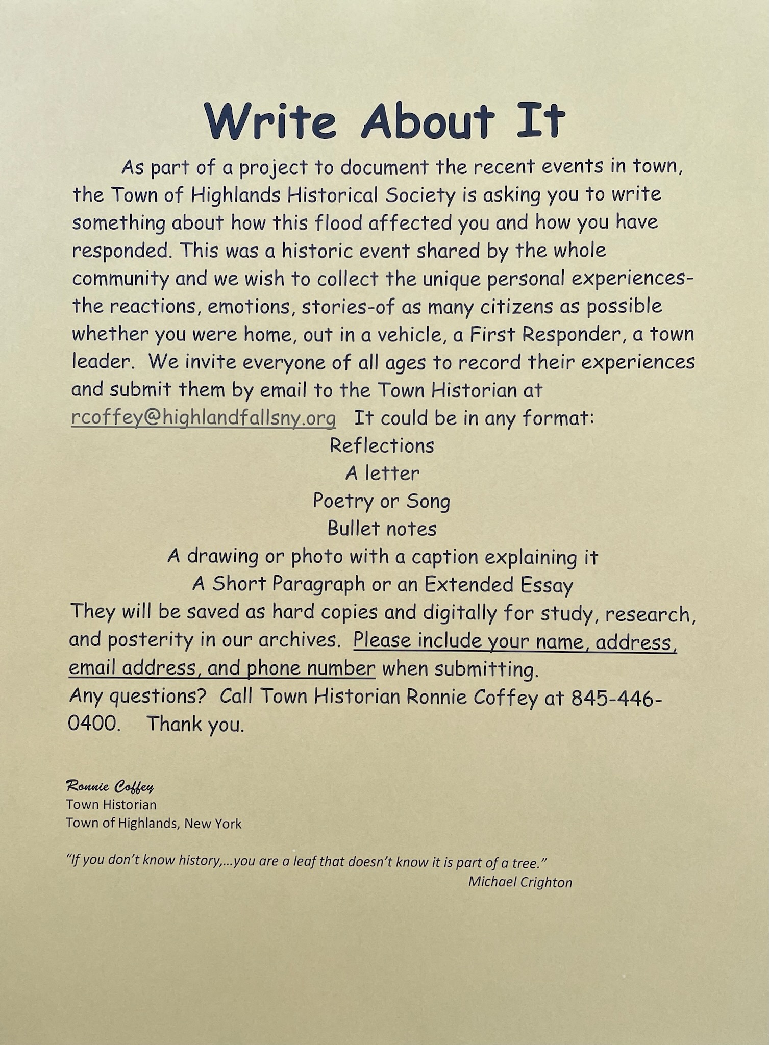 Become a Part of History—Share with the Town of Highlands Historical Society your experience during the historic flood that has affected our community.