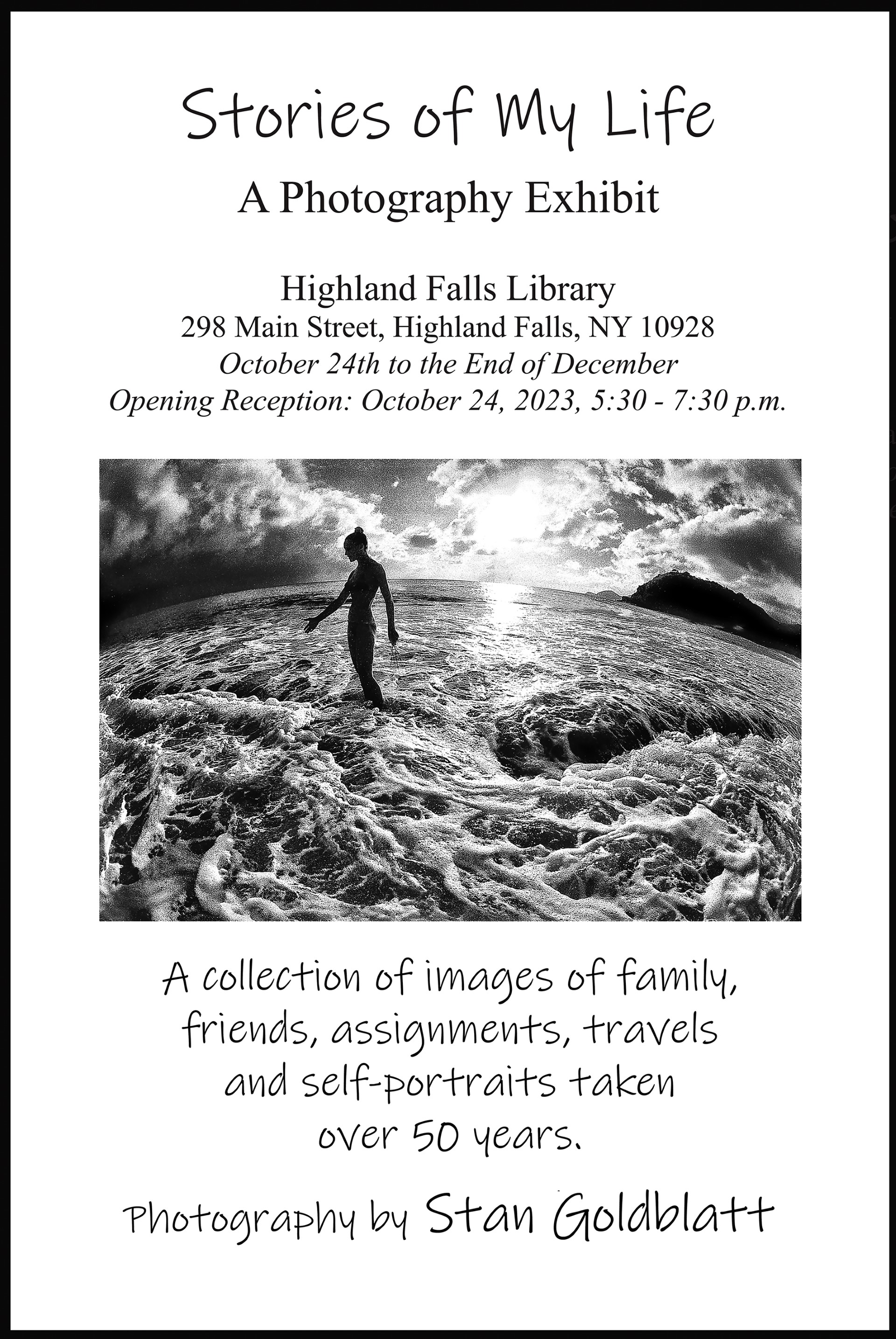 Join us on October 24th, Tuesday, from 5:30pm-7:30pm for the Opening Reception of “Stories of My Life”, a photography exhibit by Stan Goldblatt. Refreshments will be served.