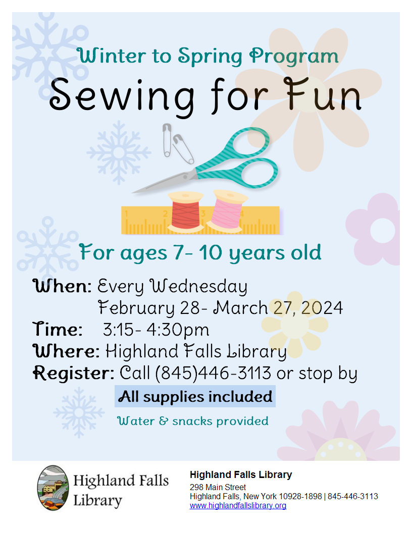 Due to the strong interest in the winter sewing program, we will be offering an additional sewing program, Winter to Spring Sewing for Fun. There are limited openings as we already have a long waiting list from the previous program. We will be giving priority to the patrons who are on this list and those who have not already participated in our first program. The sign-up list will be a tentative list. We will contact you once the list is finalized.