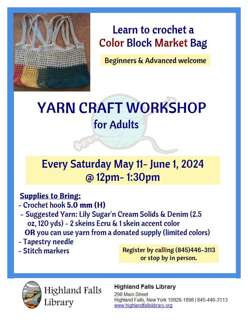 Register now for an Adult Yarn Craft Workshop. Every Saturday for 4 weeks beginning May 11th, 12:00pm- 1:30pm. Learn to crochet a Color Block Market Bag. All levels welcome!