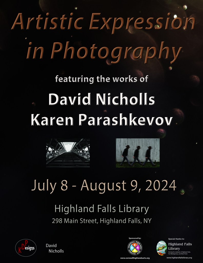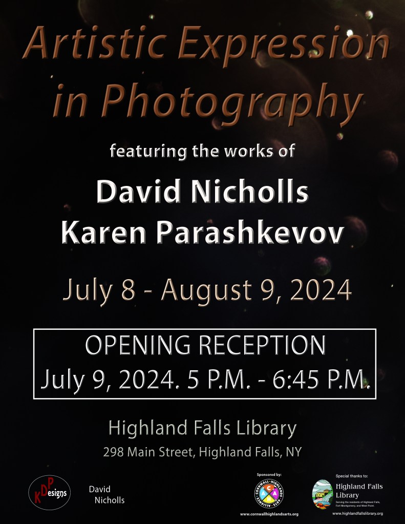 Artistic Expression in Photography featuring the works of David Nicholls & Karen Parashkevov will be displayed at Highland Falls Library July 8th- August 9th.