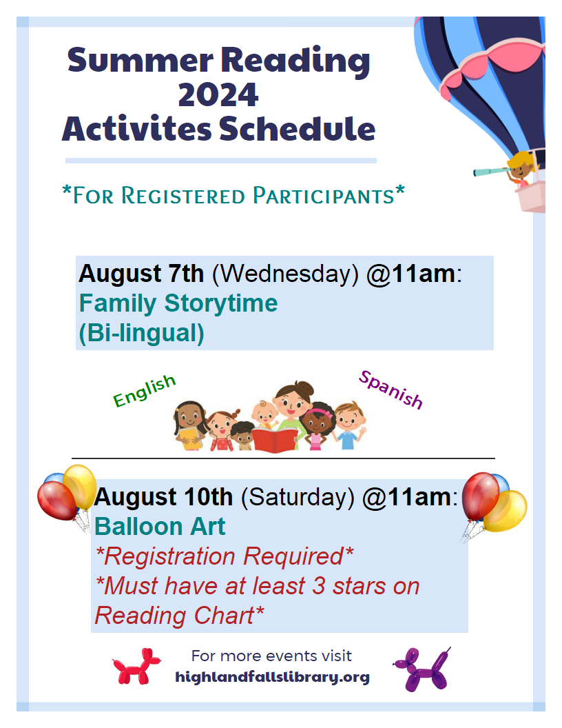 Summer Reading Activities Schedule for Week of 8/5/24 (Summer Reading Participants Only)