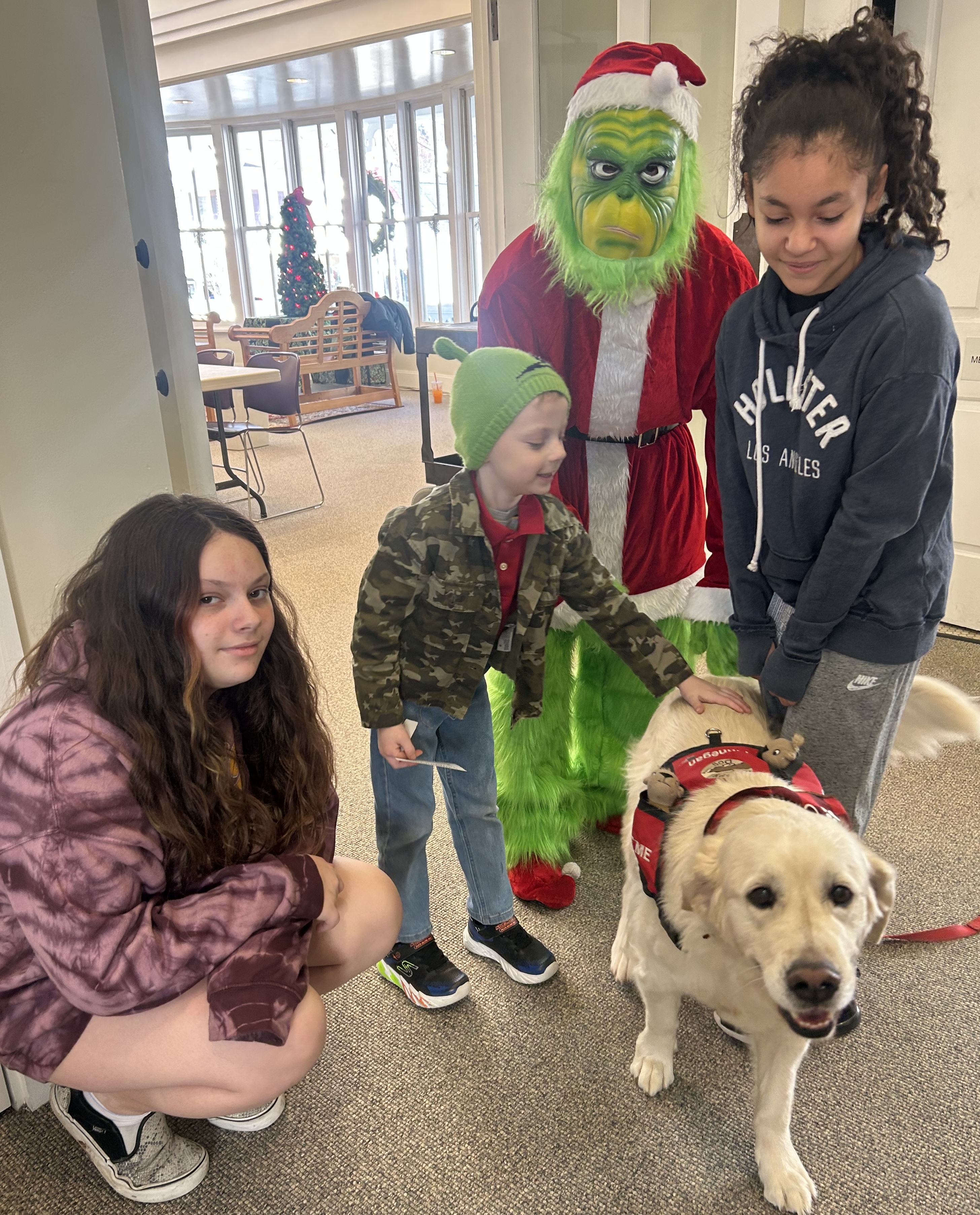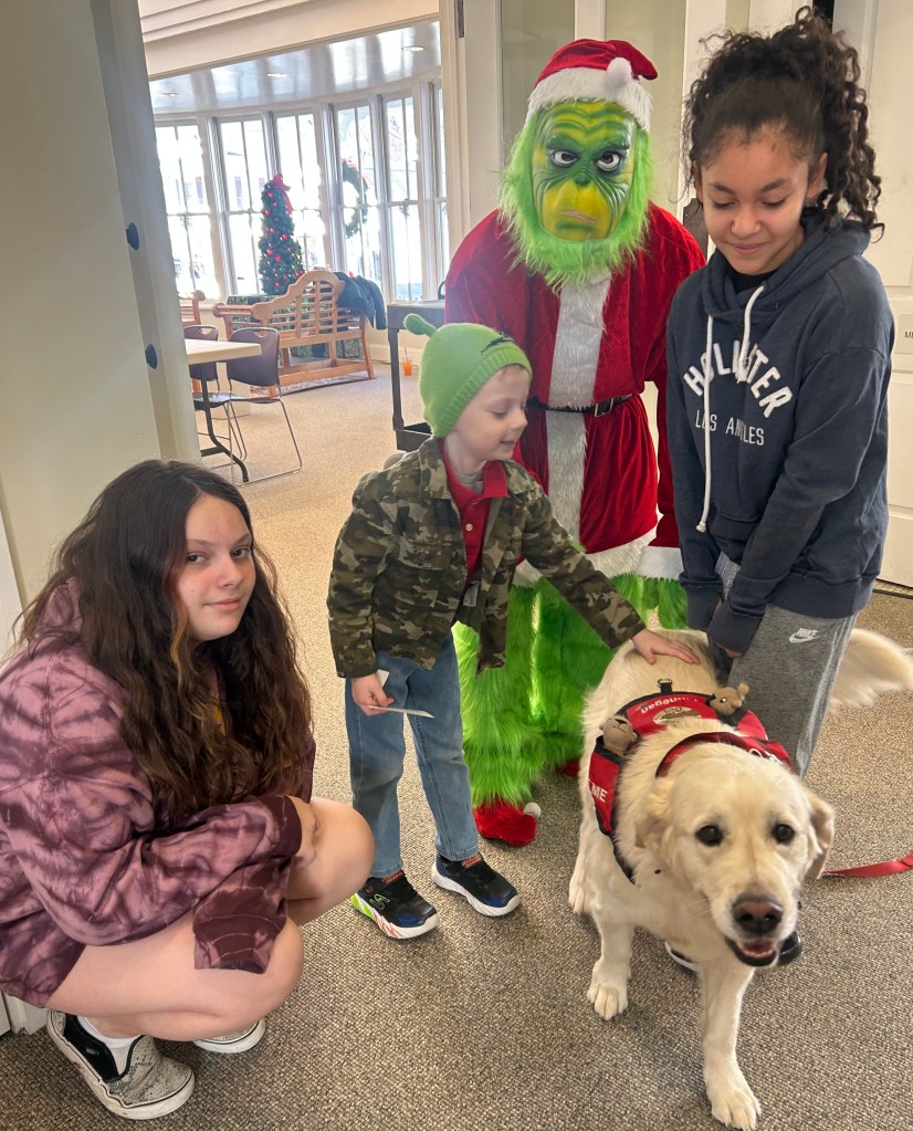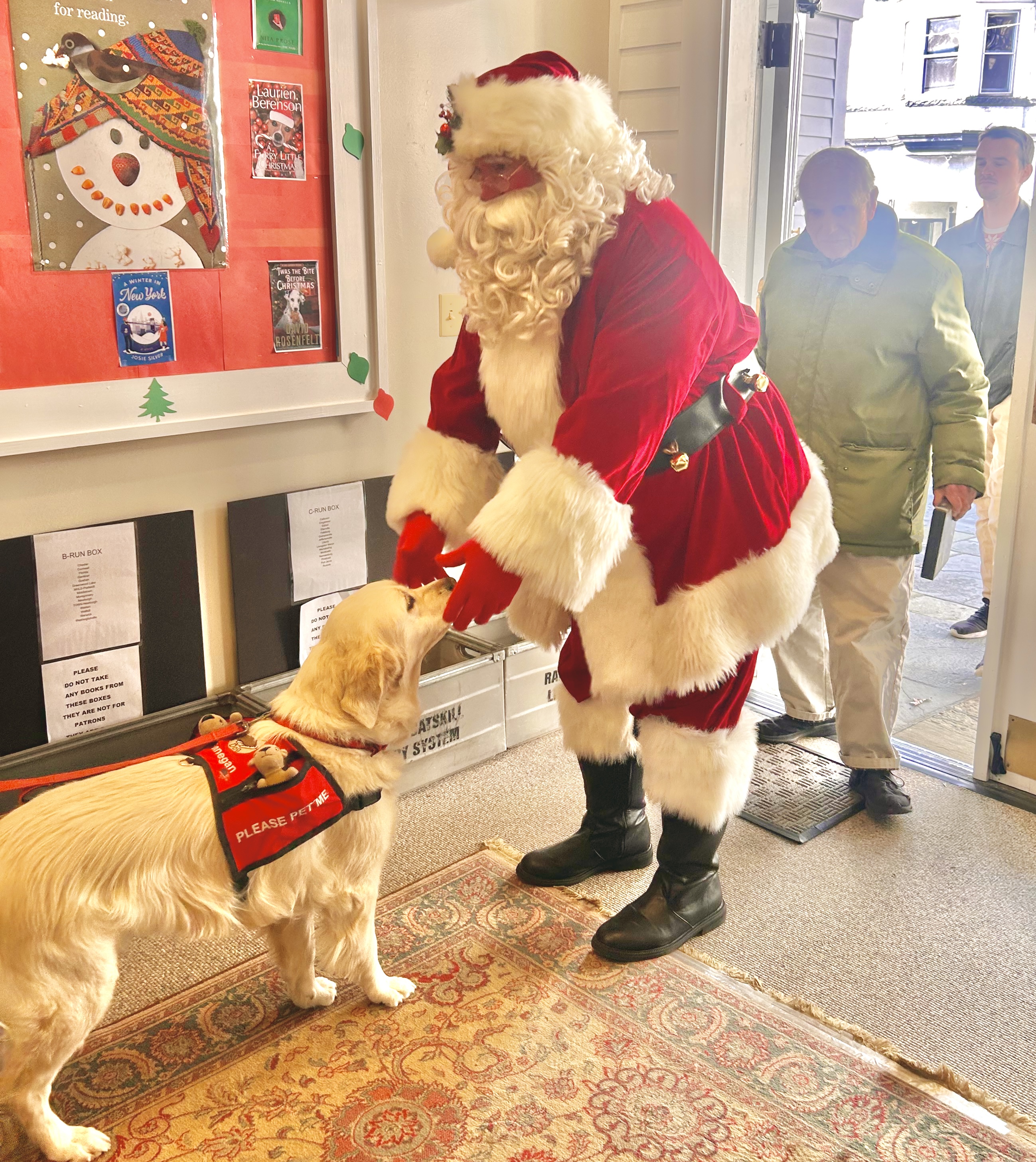 Finnegan and Barb, the library’s Reading with Dogs Team, was a special part of the festivities too. They greeted all the patrons (always with big, beautiful smiles) and they were special helpers for Santa.
