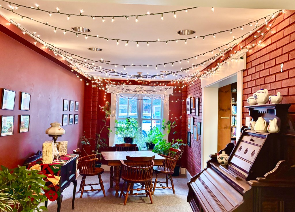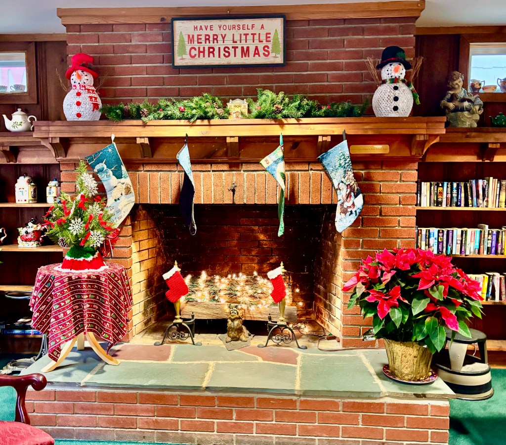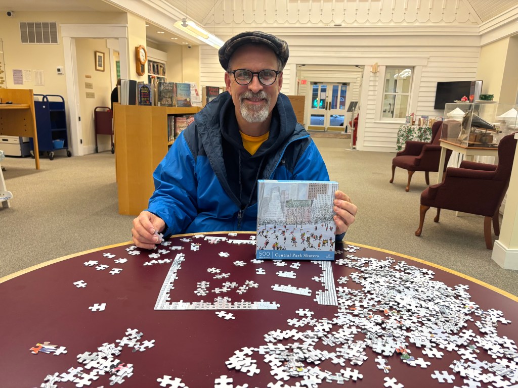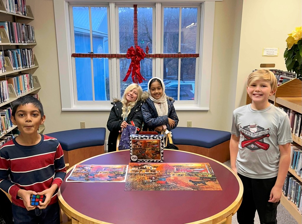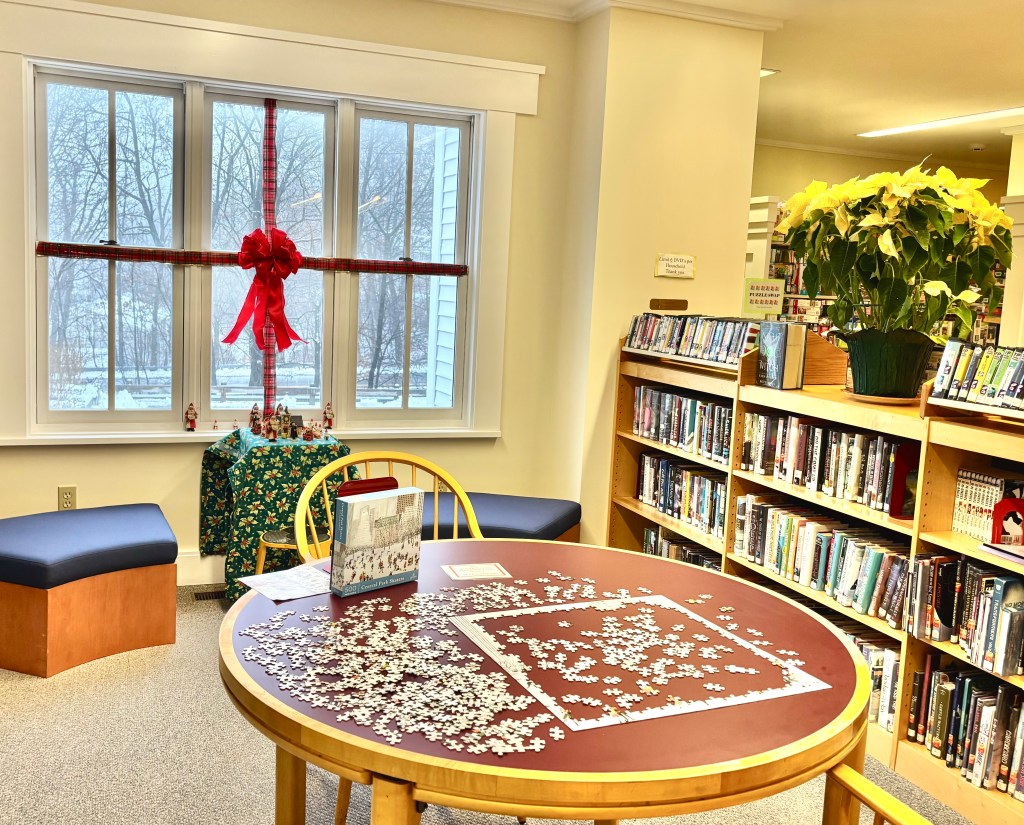 Add pieces to the new current Community Puzzle (ice skating theme) or sit in the mystery room by the fireplace (lit by lights…looks and almost feels like a fire) and read a good book.