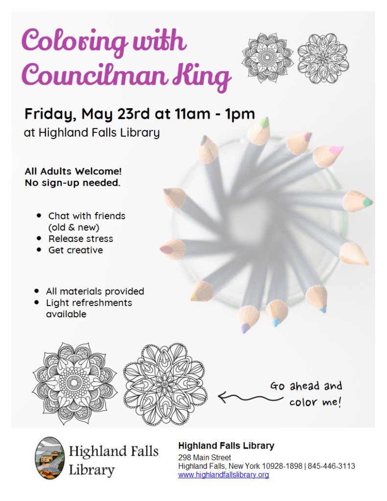 Looking for a relaxing time with friends (old and new)? Come and join Councilman King for some coloring, fun conversation and light refreshments!