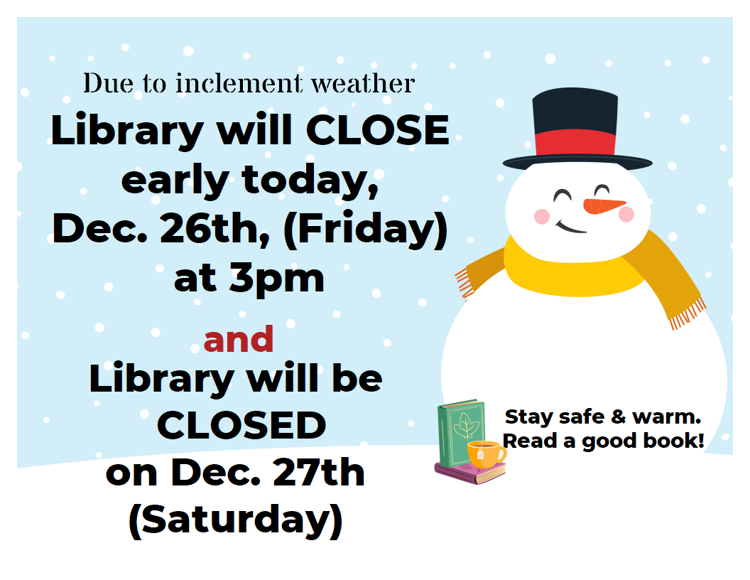 Library will CLOSE at 3pm today, Friday, and we will be CLOSED tomorrow, Saturday, Dec. 27th.