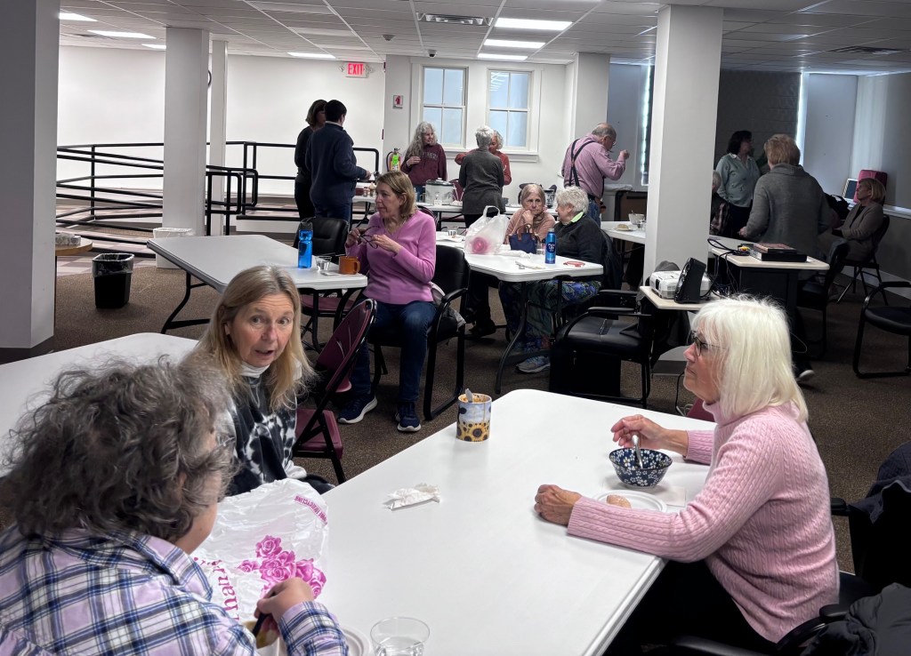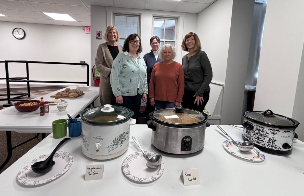 The scent of simmering Tomato Florentine Soup, Red Lentil Soup and Vegetarian Split Pea Soup filled the downstairs community room this past Saturday, March 28, 2026. Over 20 community members gathered at the library in the downstairs community room for a chance to share a meal, enjoy a film (When Harry Met Sally) and connect.