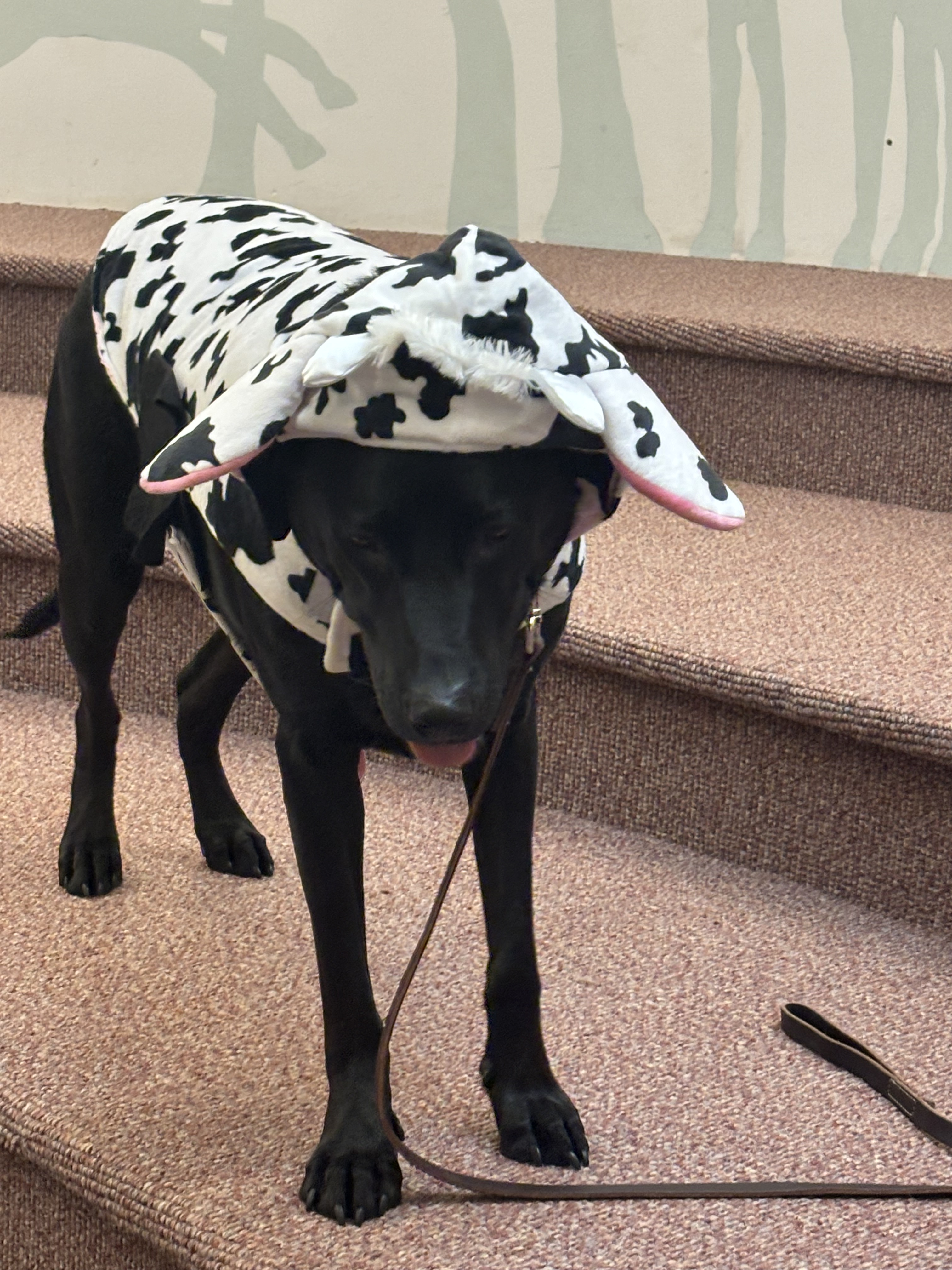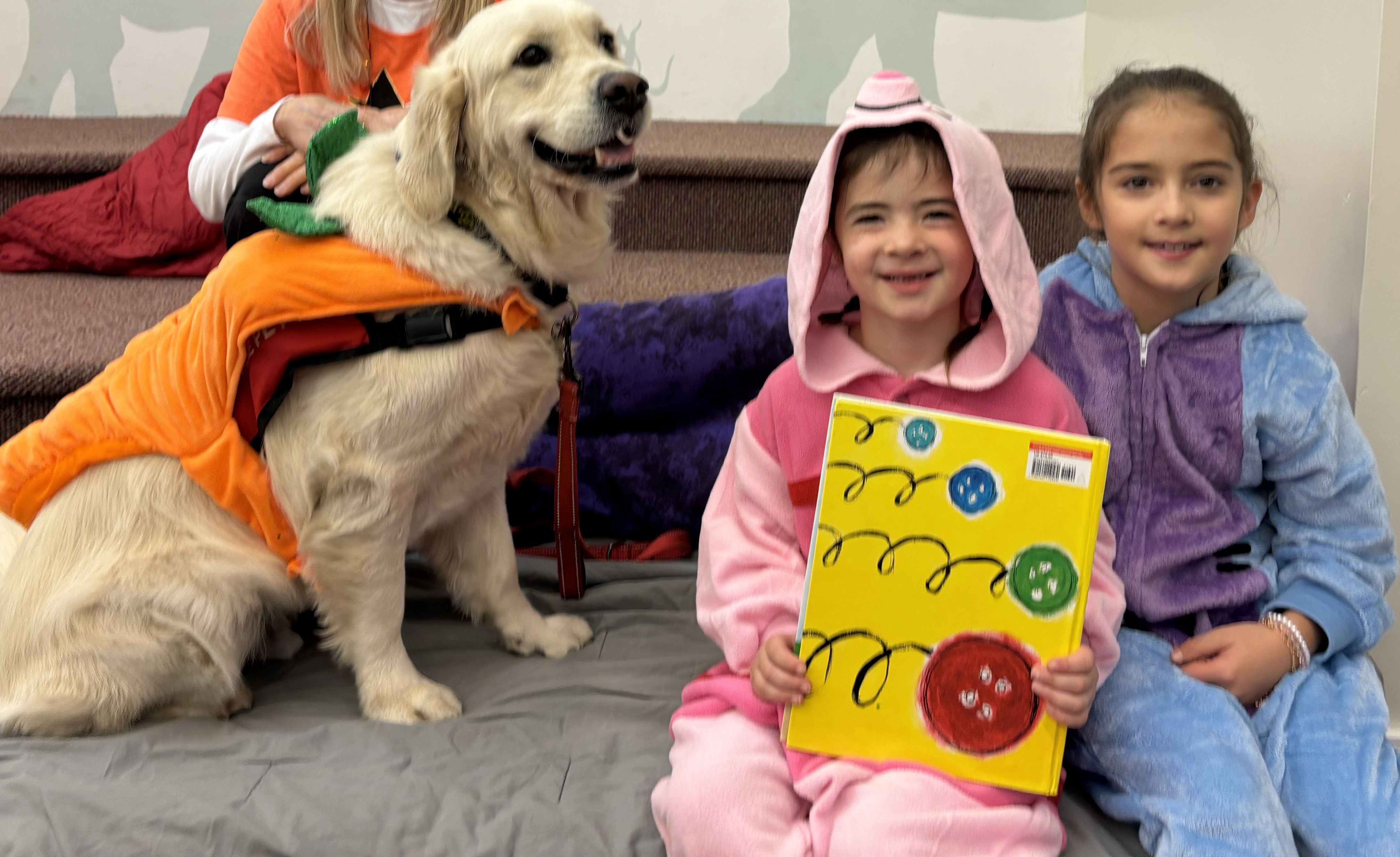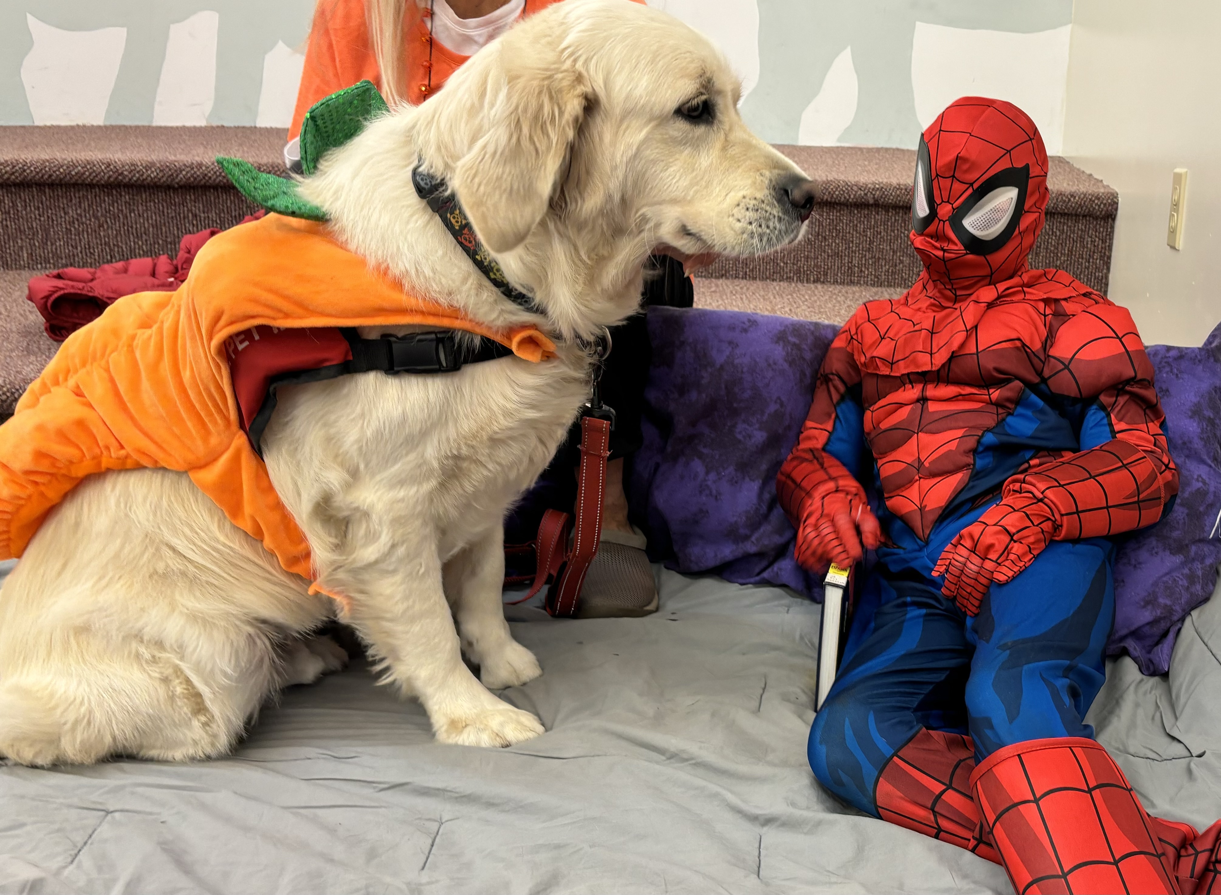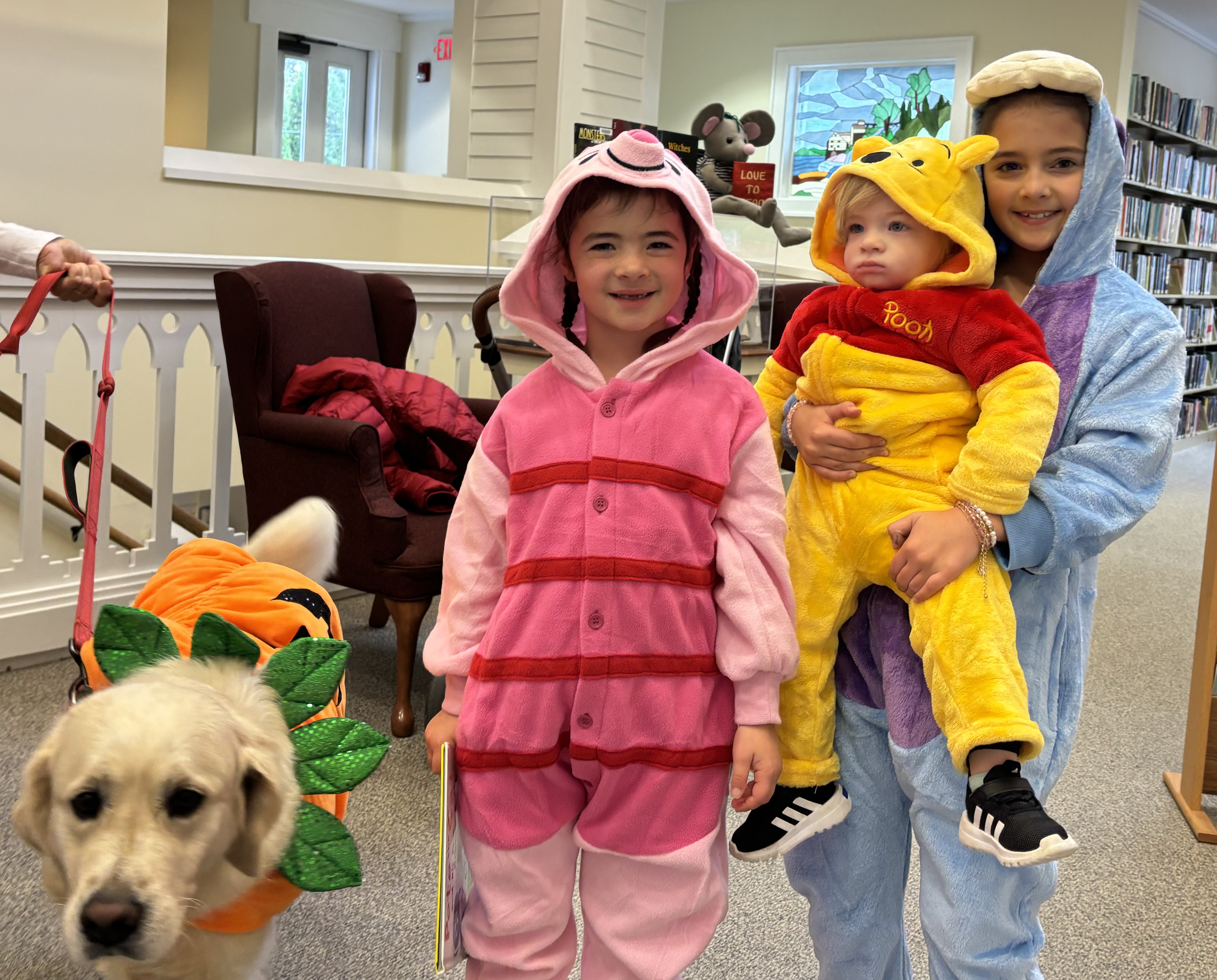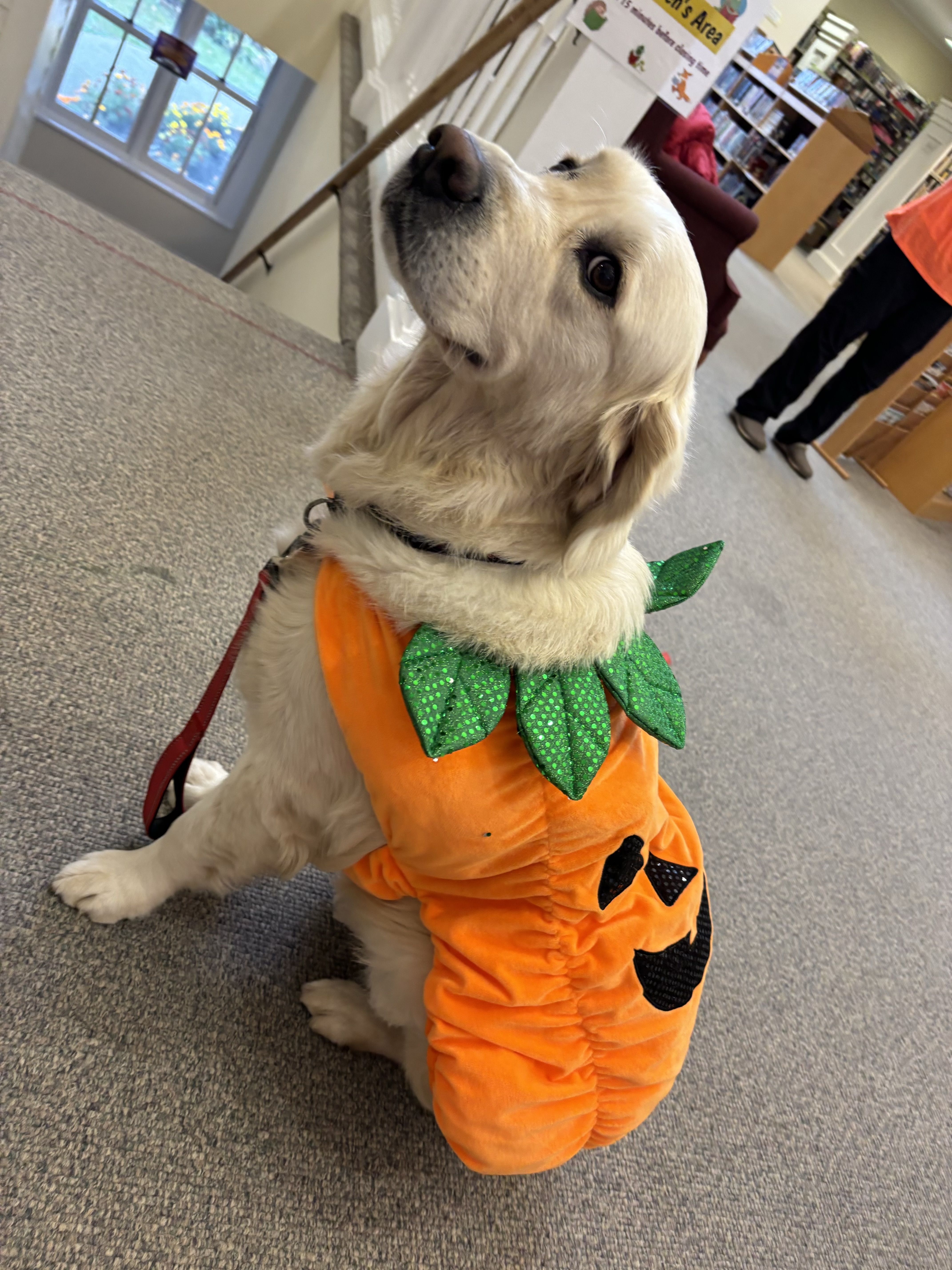 Finnegan, our Therapy Dog for Reading with Dogs Program, also came in his pumpkin costume to listen to the kids read Halloween books to him. What a fun day at the library!
