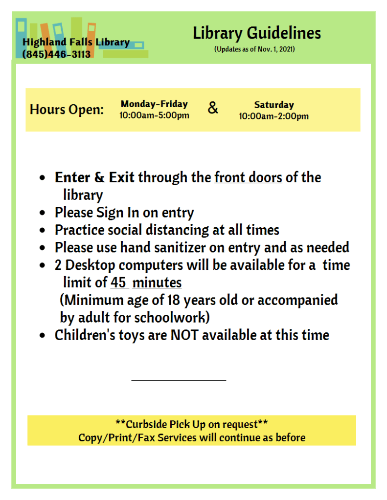 **Please call ahead during inclement weather to be sure we are open**Highland Falls Library