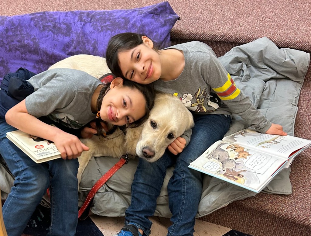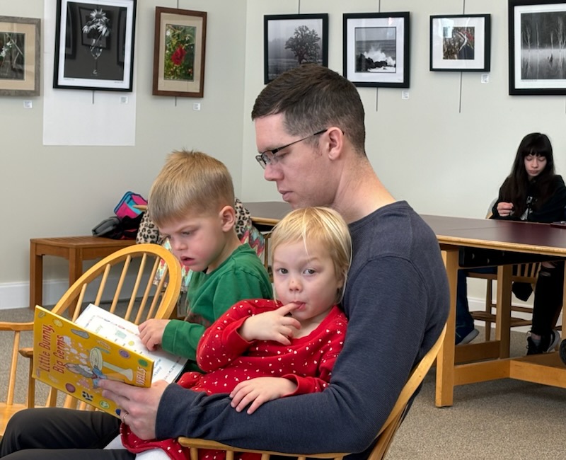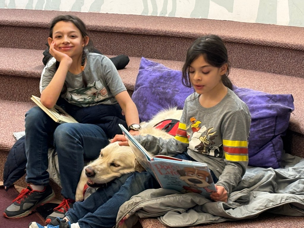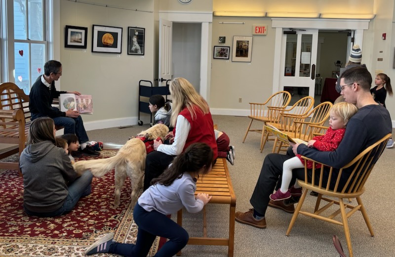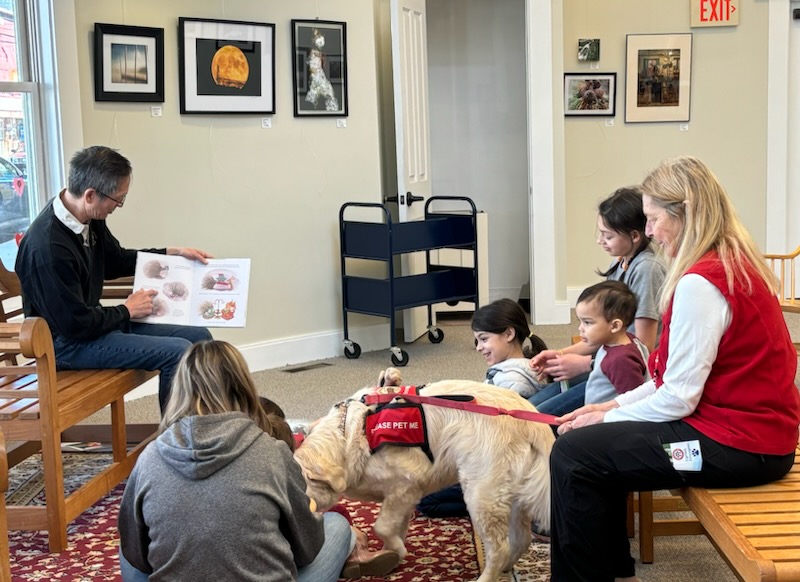 The children got to enjoy Drop-In Storytime for an hour. We had a special guest Storyteller, Phil Bond, who read fun stories to them for an hour. Barb (dog handler) and Finnegan (therapy dog) came for a special Reading with Dogs Program. First, they decided to listen in on some storytelling by Phil before getting ready for their program. Then they got to listen to some storytelling from the children. What great readers they were!